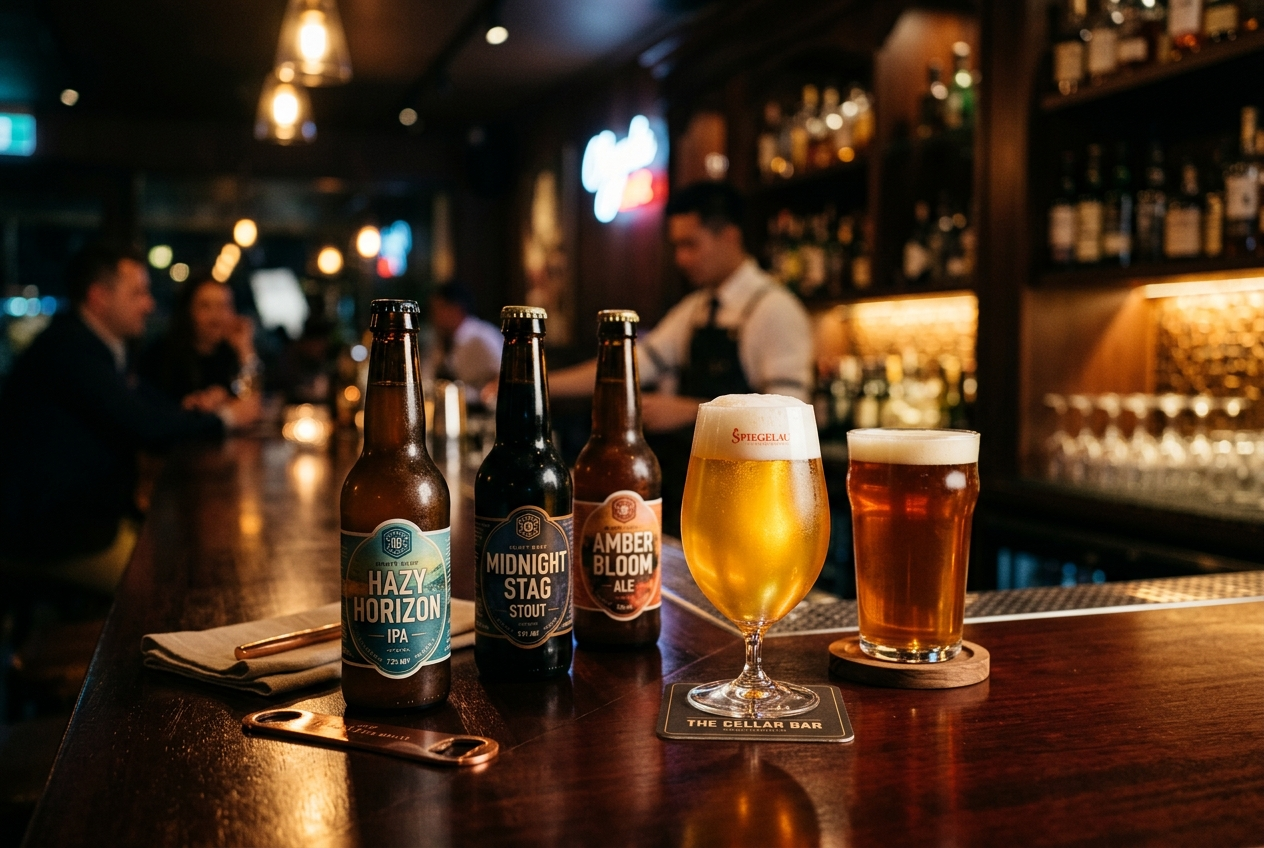 Left to right: Black Boss (Imperial Stout), Warka (Amber Ale), Warka Strong (Strong Ale), Perła (Hoppy Lager), Żywiec (Full-body Pilsener), Okocim O.K. (Lager), Żywiec Porter (Porter)